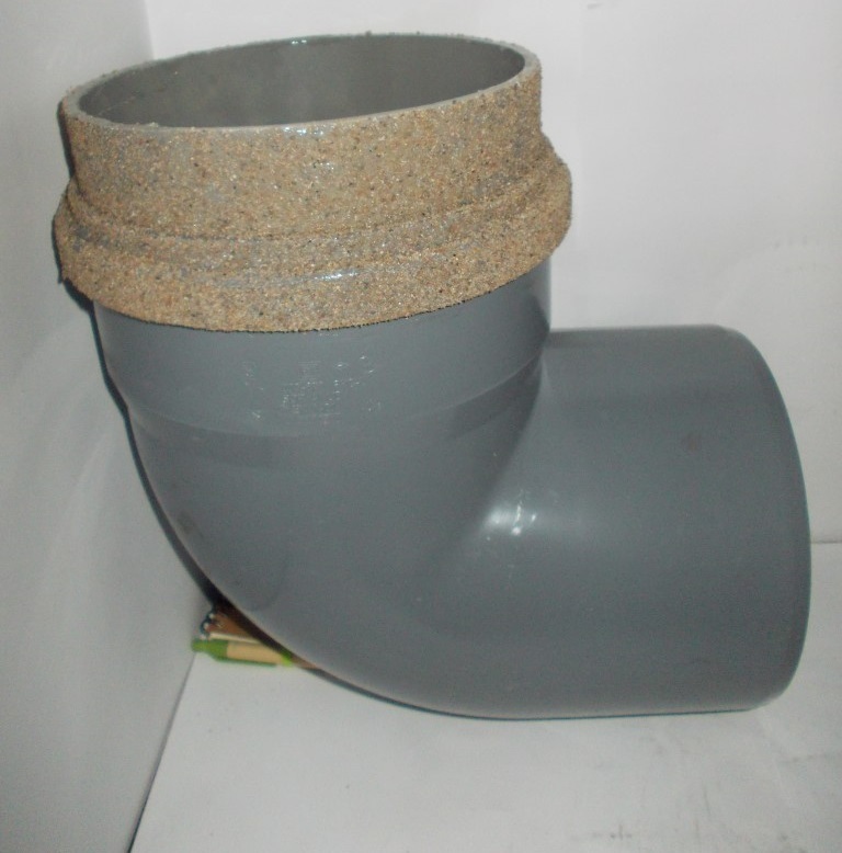 In this system the pipe has an open connection with the T-pieces and the bend below the slurry and/or water channel. The T-pieces and bend will be customized and provided with sanding. The glue that’s used for the sanding is a 2-component glue, which doesn’t form air bubbles, such as is the case with 1-component glue. By using the 2-component glue, the sanding is attached to the PVC very well.